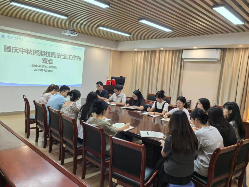 为确保师生度过一个平安祥和的中秋国庆假期,全面筑牢校园安全防线,9月30日,计算机科学与工程学院与人工智能与数字经济产业学院联合召开假期校园安全工作布置会。会议由学院党总支书记蔡岳良主持,白云校区与惠州校区全体辅导员参会。