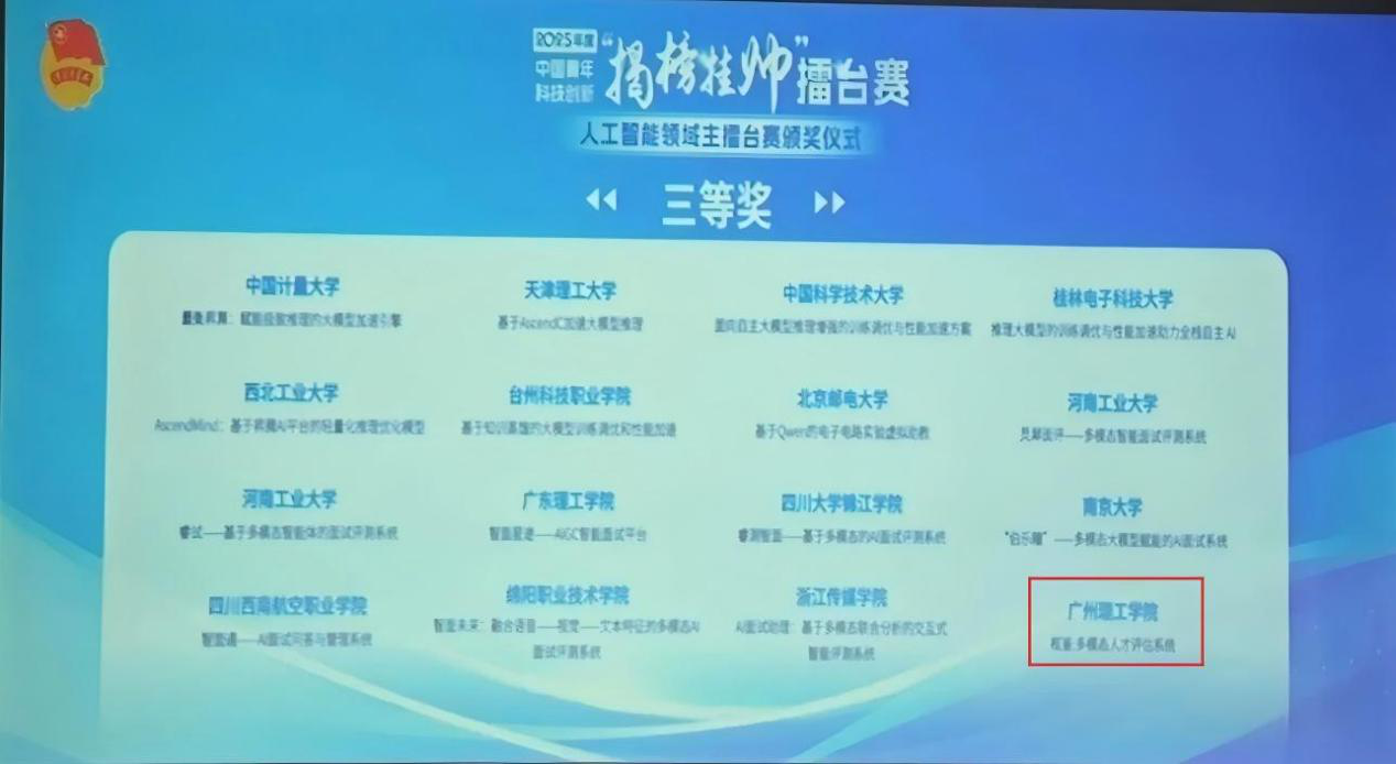 10月20日,第十九届“挑战杯”全国大学生课外学术科技作品竞赛核心赛事——2025年中国青年科技创新“揭榜挂帅”擂台赛人工智能领域主擂台赛,在华东理工大学圆满落幕。我院学子凭借扎实的科研能力与创新应用成果强势突围,一举斩获国赛三等奖1项、优胜奖1项,充分彰显学校在人工智能领域的人才培养质量与科研创新硬实力。