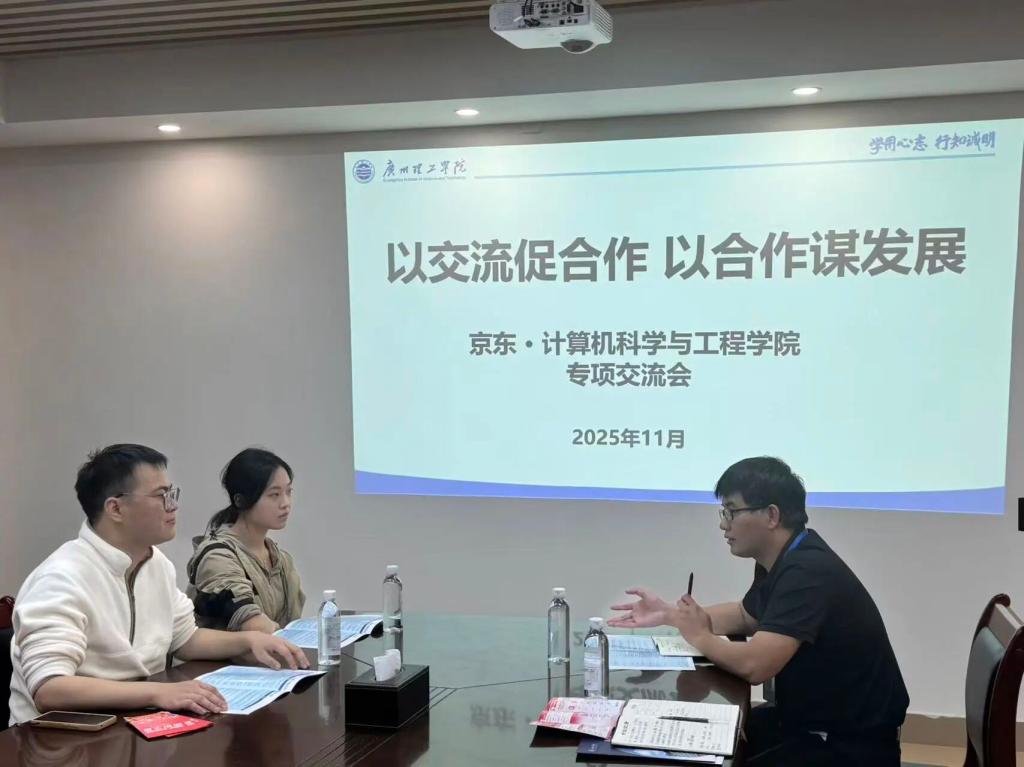 2025年11月7日,广州理工学院计算机科学与工程学院与京东集团专项交流会于4教303会议室顺利召开。京东集团业务负责人刘程锦经理,计算机科学与工程学院党总支书记蔡岳良、辅导员林嘉颖共同出席,围绕校企协同育人与人才供需对接展开深入交流,共绘合作新蓝图。