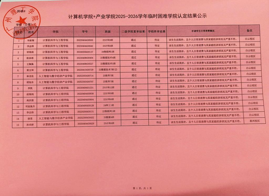 根据《广州理工学院学生资助中心关于做好 2025-2026学年秋季学期临时困难补助工作的通知》(广州理工[2022]53号)等文件精神,我院积极开展临时困难补助认定工作。经过学生本人自愿提出申请、二级学院核定工作小组审核等程序,现将2025-2026学年秋季学期临时困难补助院级认定结果予以公示。