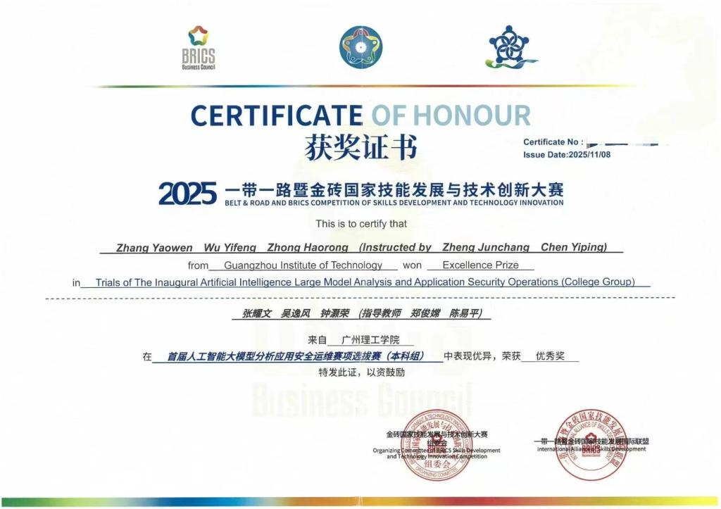 12月5日,2025“一带一路”暨金砖国家技能发展与技术创新大赛首届人工智能大模型分析应用安全运维赛项获奖证书,正式送达学院参赛学子手中。学院两支参赛队伍凭借扎实的AI技术功底、敏锐的安全运维思维与高效默契的团队协作,在本科组激烈角逐中脱颖而出,分别斩获二等奖与优秀奖,充分彰显学校在人工智能与网络安全交叉领域优质的人才培养成效。
