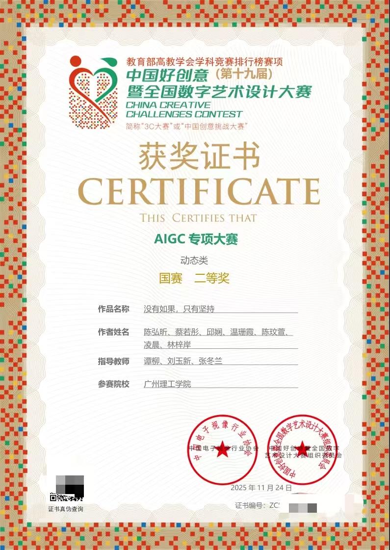 近日,2025年中国好创意大赛全国总决赛圆满落幕,赛事结果正式公示。我校计算机科学与工程学院学子在这场全国性创意盛宴中表现亮眼,由陈弘昕同学领衔,蔡若彤、邱娴、温珊霞、陈玟萱、凌晨、林梓岸等同学组成的团队,在谭柳、刘玉新、张冬兰三位老师的悉心指导下,凭借作品《没有如果,只有坚持》勇夺动态类国赛二等奖,指导教师团队同步荣获国赛优秀指导教师奖二等奖,为学院赢得了荣誉。