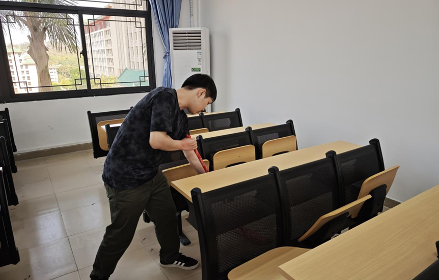 打扫过程中,同学们热情高涨、分工协作、默契配合,展现出新时代青年学子的良好风貌。大家不怕脏、不怕累,有的弯腰俯身清扫地面碎屑与污渍,不放过任何卫生死角;有的手持抹布,细致擦拭桌面、讲台、黑板及门窗玻璃,让每一处都焕然一新;有的整理课桌椅,将桌椅摆放得整整齐齐,规范收纳清洁工具;还有的同学仔细清理桌兜内的杂物,擦拭多媒体设备周边灰尘,全力保障教学设施整洁完好。整个打扫现场井然有序,同学们忙碌的身影穿梭在各个教室,成为春日校园里一道温暖的风景线。