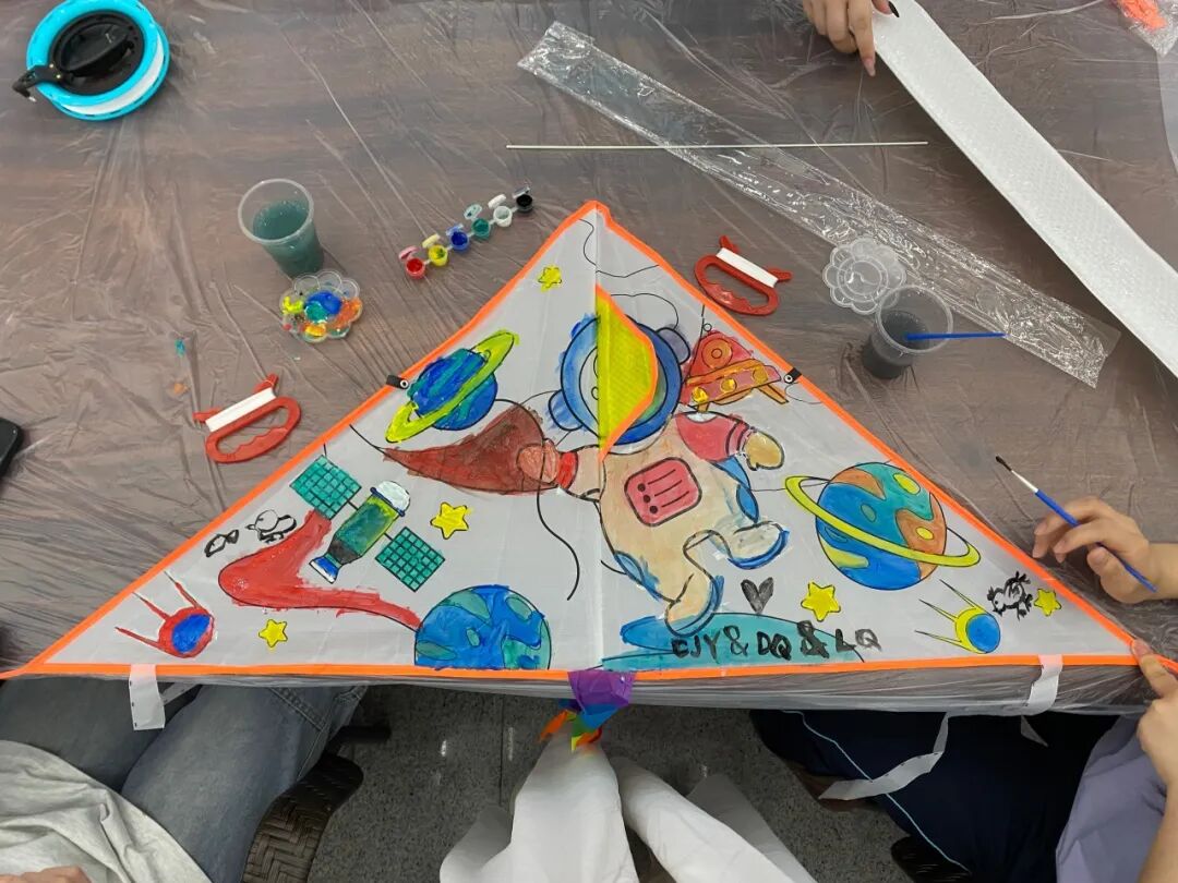 创作的时光总是充满欢声笑语。有的小组低头勾勒线条,将校园的钟楼、奔跑的身影画在风筝上;有的小组调配着色彩,用明黄、浅蓝、粉紫晕染出春日的晚霞;还有的小组突发奇想,在风筝上写下“逐风而上”“不负春光”的字句,让文字与纸鸢一同奔赴蓝天。大家分工协作,有人负责打底稿,有人专注上色,有人整理工具,原本素净的风筝,在指尖渐渐变得鲜活生动,每一笔都藏着青春的巧思与温度。