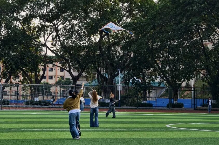 夕阳西斜时,创作告一段落。同学们捧着各自的作品,结伴走向广州校区小足球场。绿茵场上,春风正好,大家攥着线轴,迎着风奔跑、放线。一只只色彩斑斓的纸鸢缓缓升空,有的像振翅的蝴蝶,有的像舒展的云朵,有的带着俏皮的卡通图案,在湛蓝的天空中摇曳生姿。线轴在手中转动,笑声在风里飘荡,那些藏在风筝里的梦想与期许,也随着纸鸢一同飞向更高更远的地方。