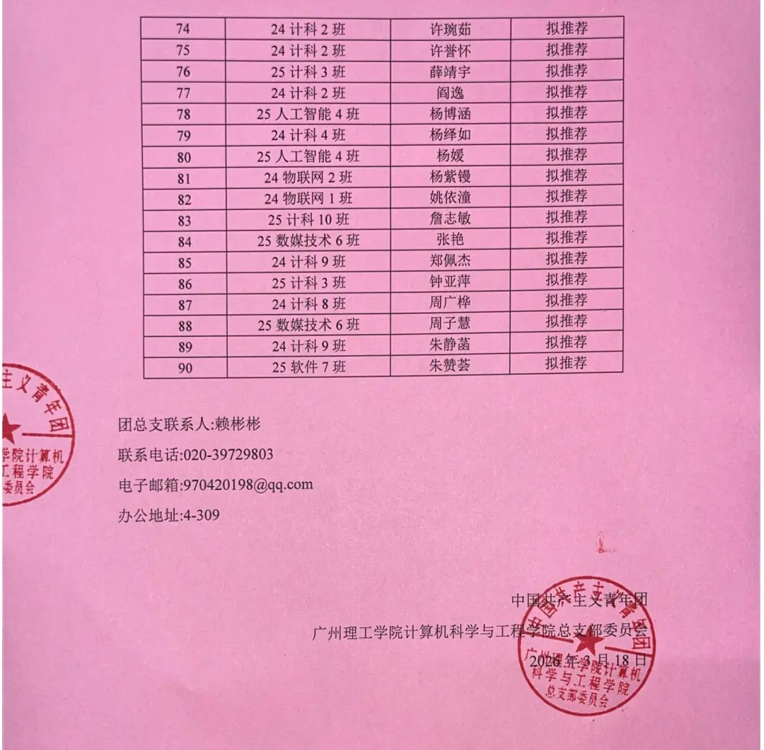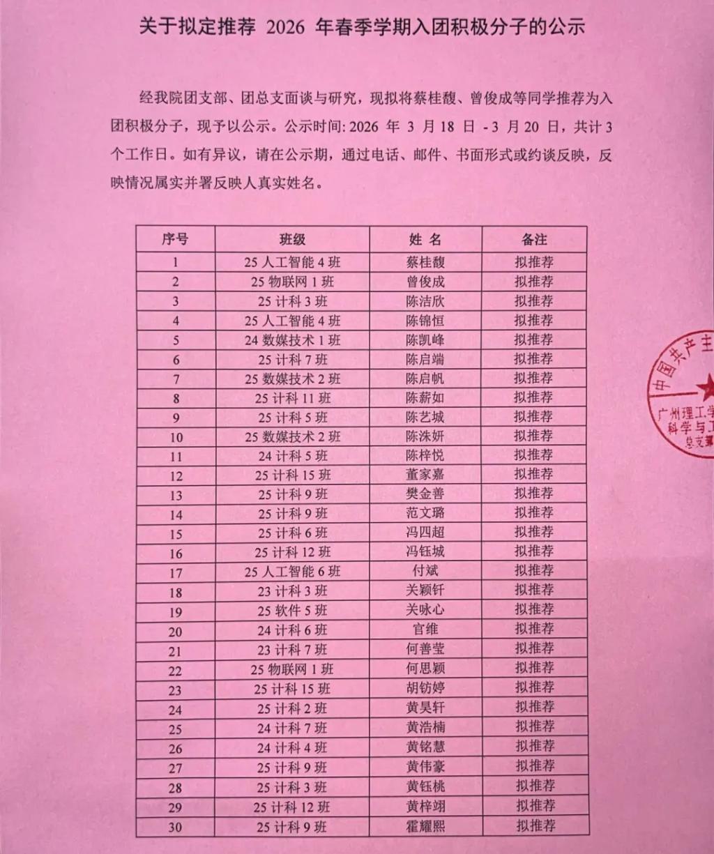 经我院团支部、团总支面谈与研究,现拟将蔡桂馥、曾俊成等同学推荐为入团积极分子,现予以公示。公示时间:2026年3月18日-3月20 日,共计3个工作日。如有异议,请在公示期,通过电话、邮件、书面形式或约谈反映,反映情况属实并署反映人真实姓名。