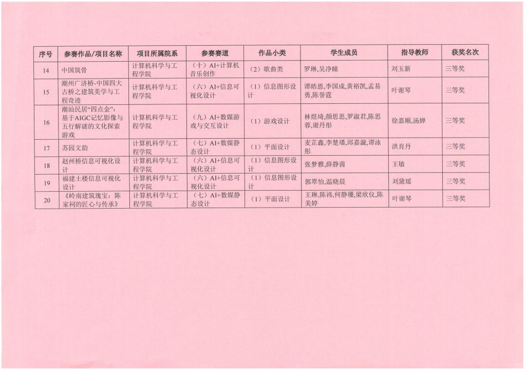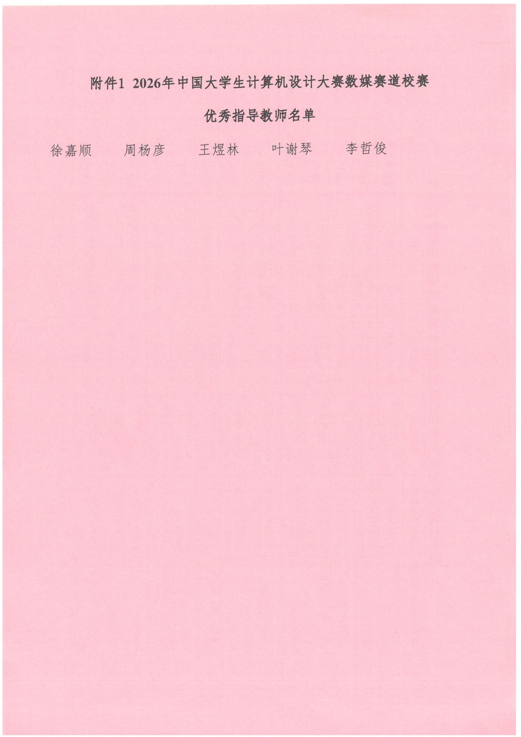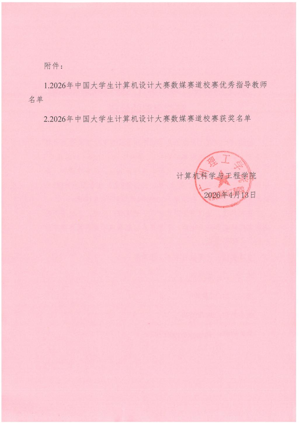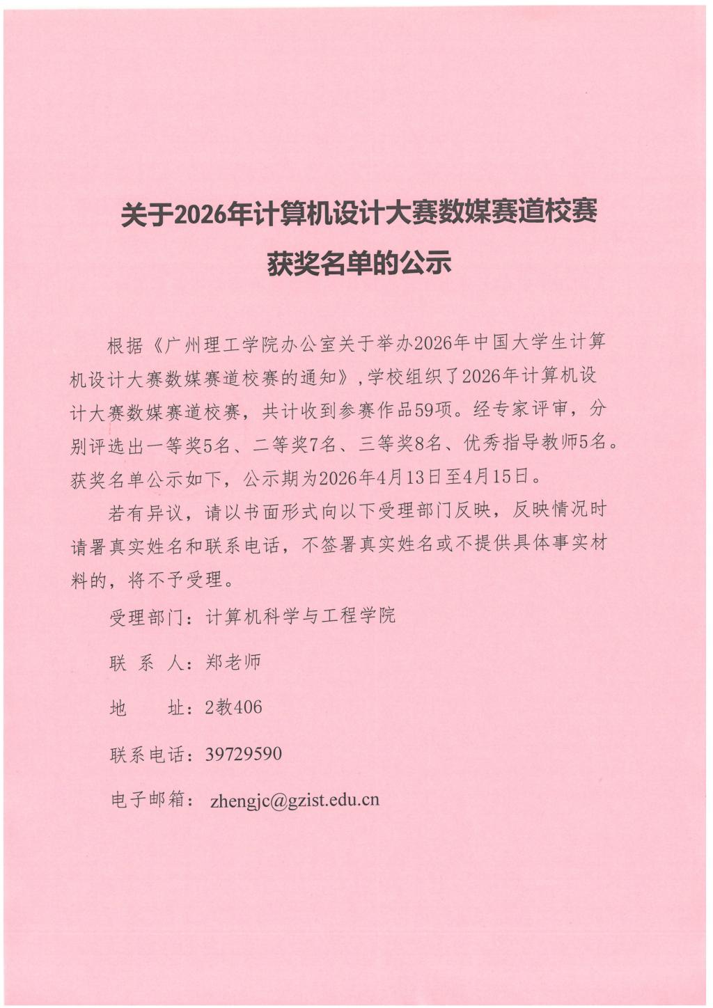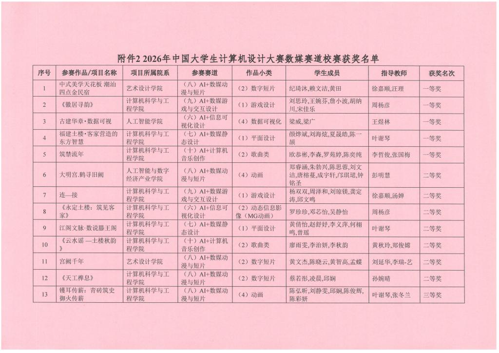 根据《广州理工学院办公室关于举办2026年中国大学生计算机设计大赛数媒赛道校赛的通知》,学校组织了2026年计算机设计大赛数媒赛道校赛,共计收到参赛作品59项。经专家评审,分别评选出一等奖5名、二等奖7名、三等奖8名、优秀指导教师5名。获奖名单公示如下,公示期为2026年4月13日至4月15日。